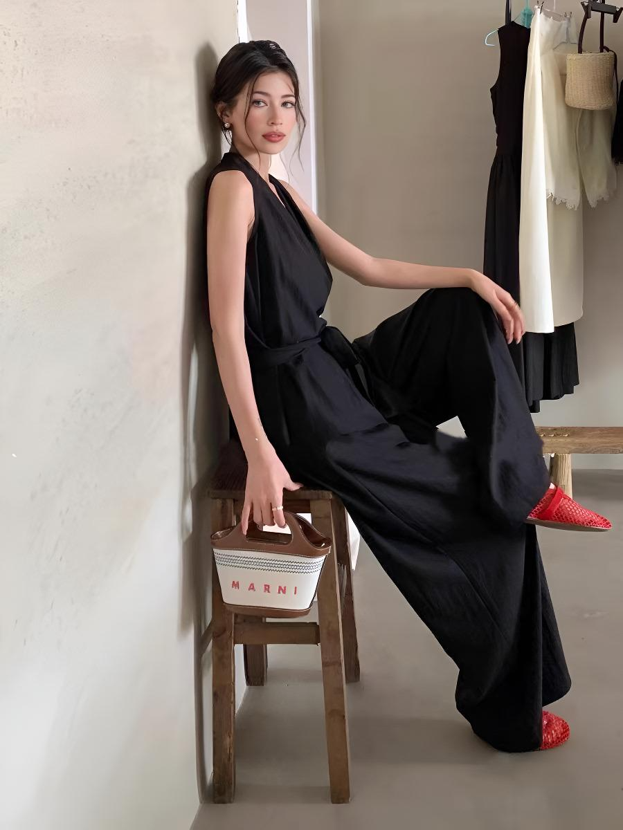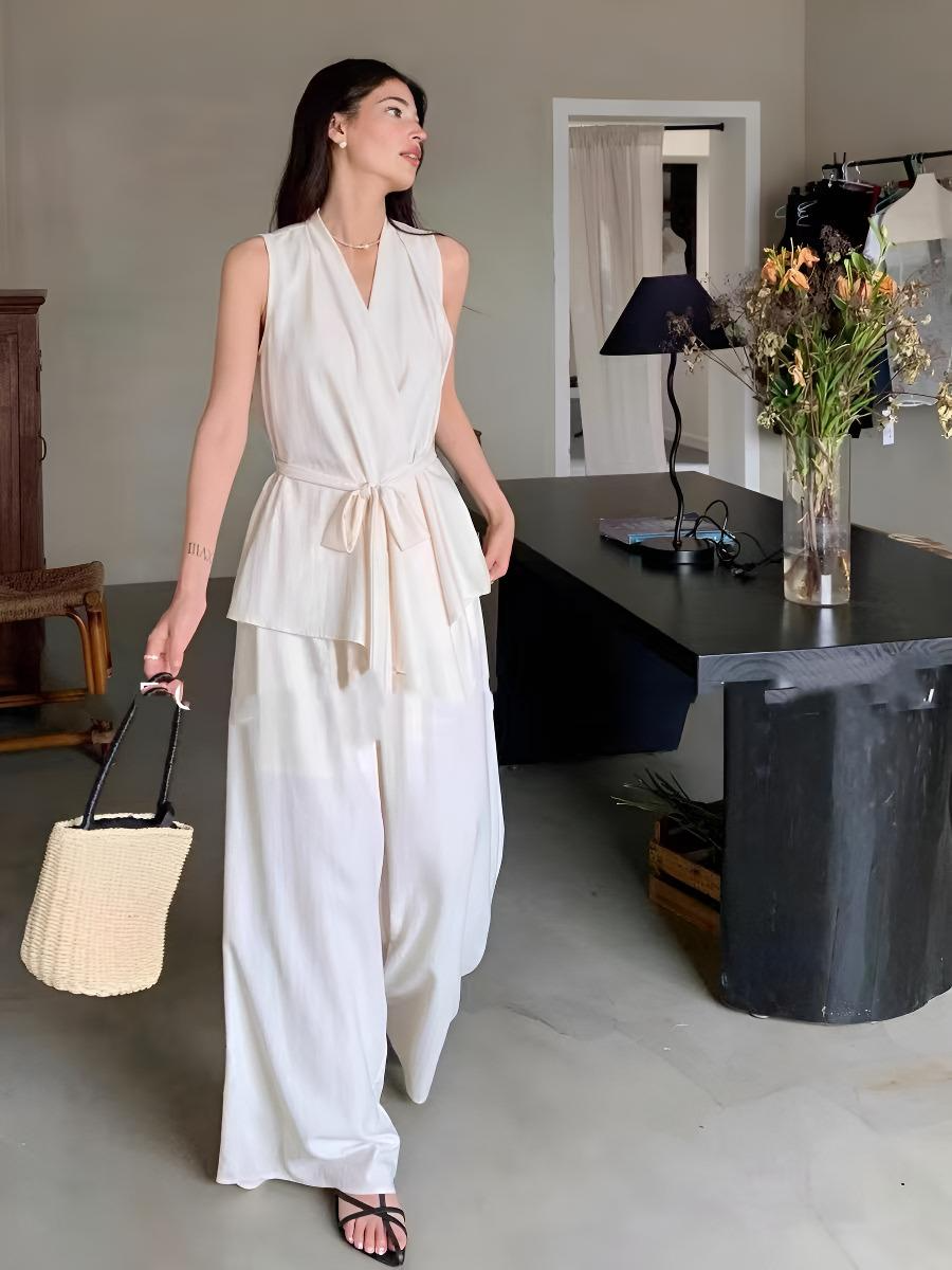 Two-piece set featuring a sleeveless wrap-style top with waist tie and coordinated wide-leg pants. Soft drape and relaxed fit. Lightweight woven fabric.